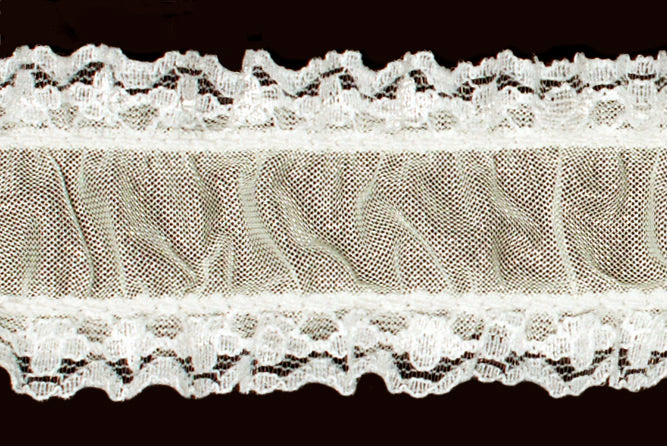 1 1/2" wide ivory gathered stretch lace, with an sheer ruched tricot center flanked by floral ruffled lace. This is perfect for a garter. Made in England.