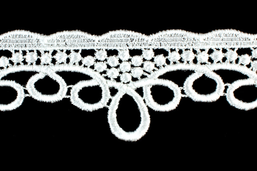 1 1/2" wide ivory Venise lace; this is an edging lace with a dot motif, and a lovely looping open scrolled border.