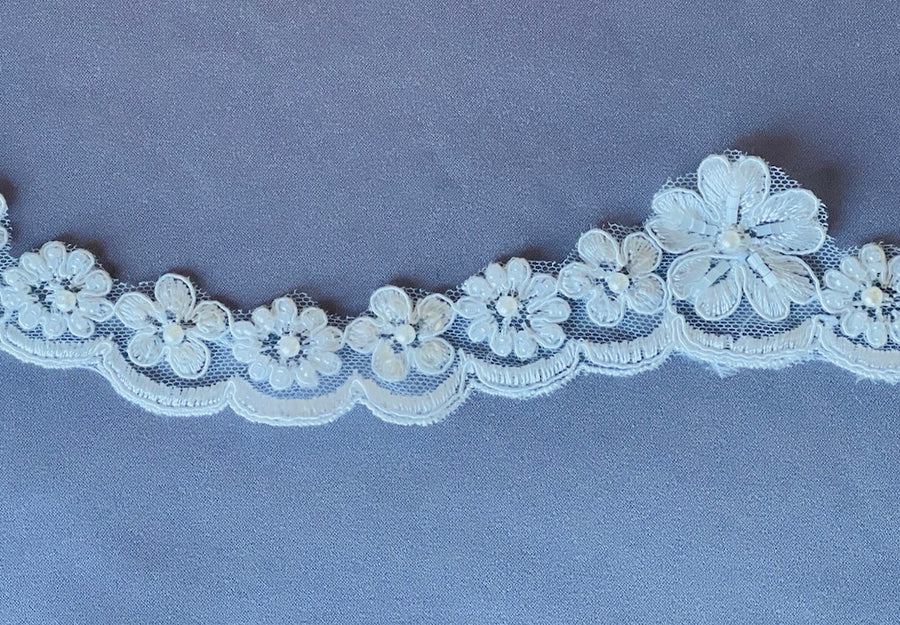 1 1/2"/4 cm wide light ivory beaded and sequined edging Alençon style lace trim. This is beaded with clear iridescent sequins, bugle beads, and ivory pearls.