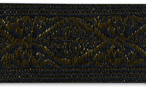 1 1/2" wide woven ribbon in a design of antique gold metallic graceful floral medallions on a black background, and with wide metallic borders.