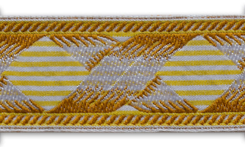 1 1/2" wide woven ribbon of ombré golden rope woven into an "X" on a yellow and white striped background and with golden rope borders. LIMITED STOCK.