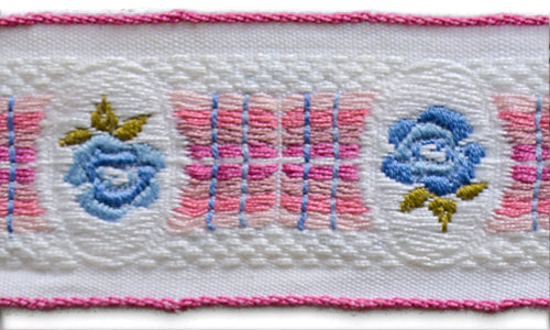 1 1/2" woven cotton ribbon, with medallions of deep blue pansies interspersed with pink plaid bands, and on a textured white background. 100% cotton.