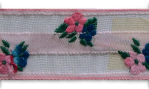 1 1/2" woven ribbon, with sweet pink primroses on a pink and white striped background, and with thin pink borders. LIMITED STOCK.