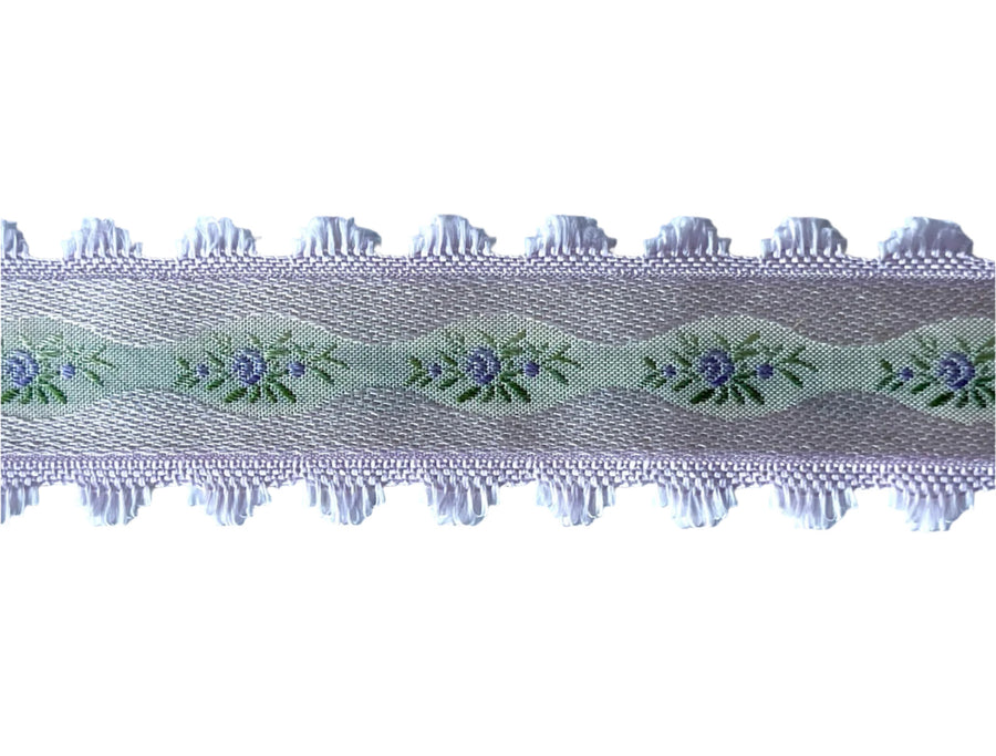 1 1/2" pale pink woven ribbon with row of violet roses on a cream background running down the center and picot edges. Made in France.