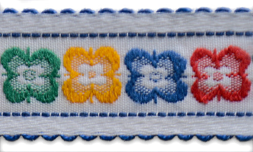 1 1/2" wide vintage woven ribbon in a design of 4-petaled red, yellow, green, and blue flowers on a white background, and with sweet blue scalloped edges. 100% cotton.