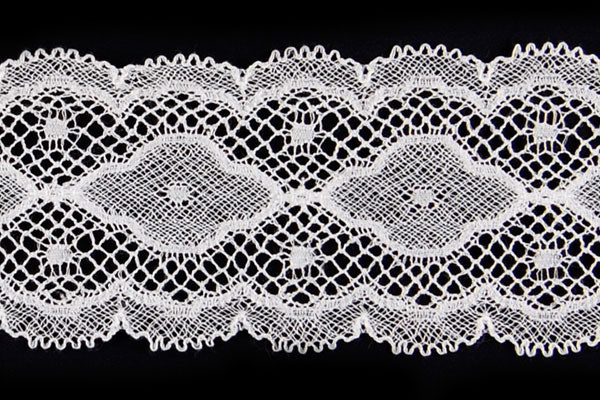 1 1/2" wide white double edged heirloom lace, with double-scalloped borders, in a delicate rosette motif. 90% Cotton, 10% Nylon. Please use a pressing cloth and a cool iron, if you want to starch and press this lace. Made in France.