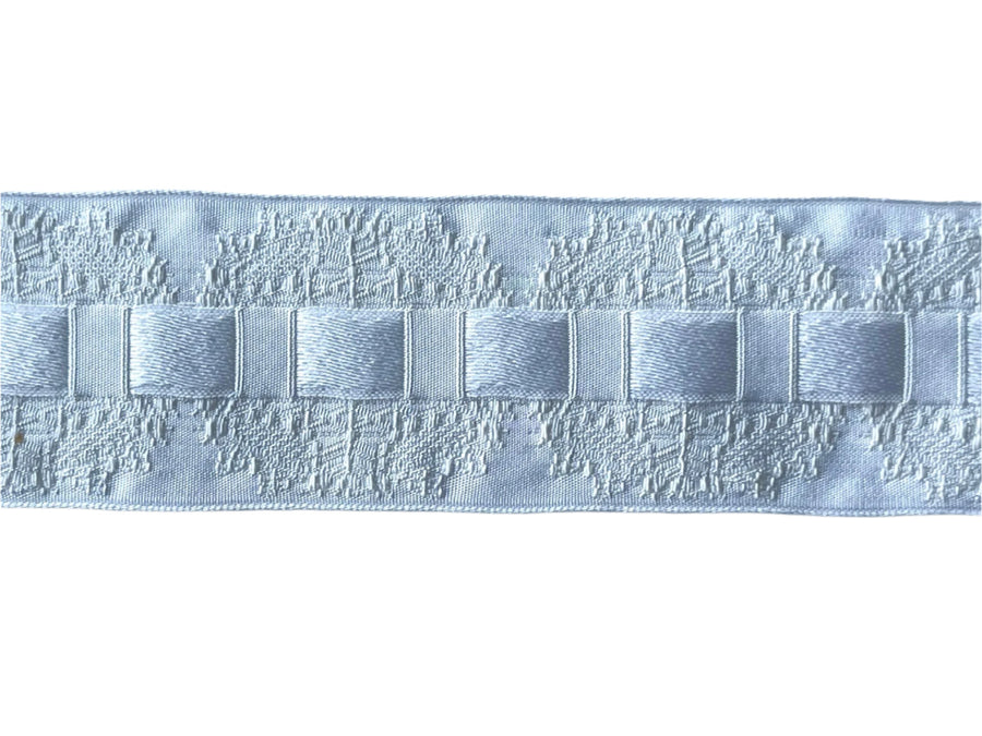 1 1/2" white brocade ribbon with 5/8" wide satin ribbon threaded down the center over tone-on-tone medallions. Made in France,