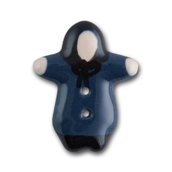 1 1/4" two-hole glassy ceramic button, depicting an Amish woman.