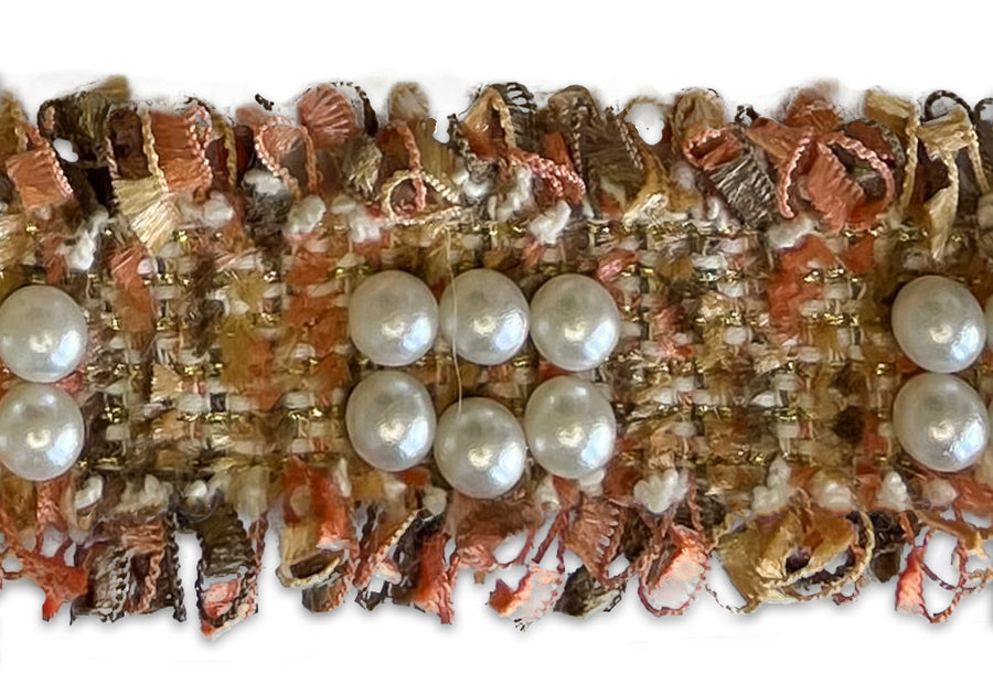 1 1/4" wide trim with rectangular clusters of pearls on a band in autumnal shades of peach, rust, brown, and beige flanked by textured fringe. This trim is perfect for sewing haute couture garments such as French designer-inspired jackets - layer your trims for a unique and special look! Made in France.