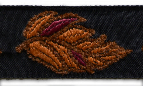 1 1/4" wide woven vintage ribbon in a design of chocolate, wine, and pumpkin autumn leaves on a black background.