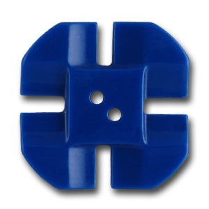 1 1/4" square, two-hole, bright denim blue vintage button, with a slightly raised motif that is reminiscent of a pinwheel. This is a plastic button.