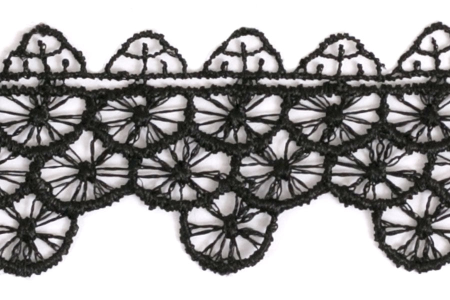 1 1/4" wide black Venise edging lace in a circular geometric pattern - perfect to trim romantic garments. Add this lace to bed linens for a luxurious touch! Made in England.