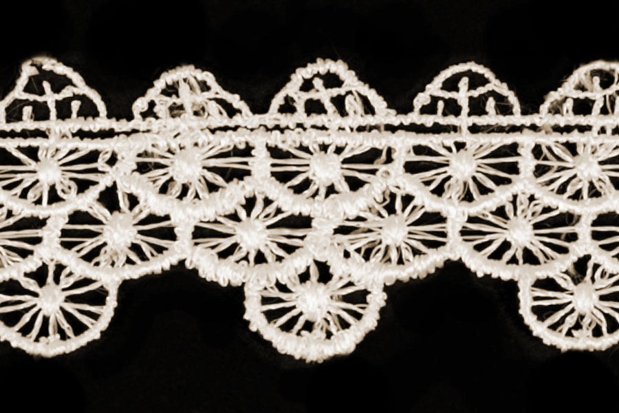 1 1/4" wide ivory Venise edging lace in a circular geometric pattern - perfect to trim romantic garments. Add this lace to bed linens for a luxurious touch! Made in England.