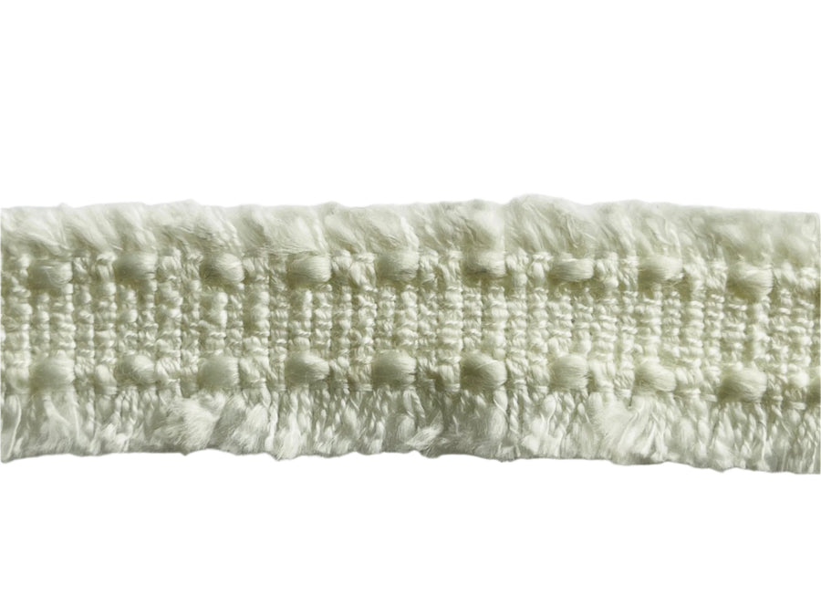1 1/4" wide textured trim in classic creamy ivory with short fringe on both edges.