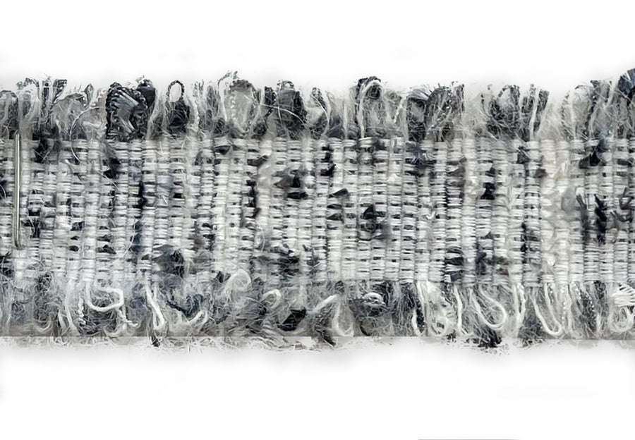 1 1/4" wide woven trim in flecked antique blue and white with short bi-colored fringe on both edges. This trim is perfect for sewing haute couture garments such as French designer-inspired jackets - layer your trims for a unique and special look! Made in England.