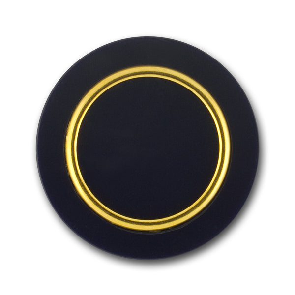 1 1/4" glossy flat plastic button, in deep navy blue and accented with a thin gold metal inner rim. A very classic button. Plastic shank backing..
