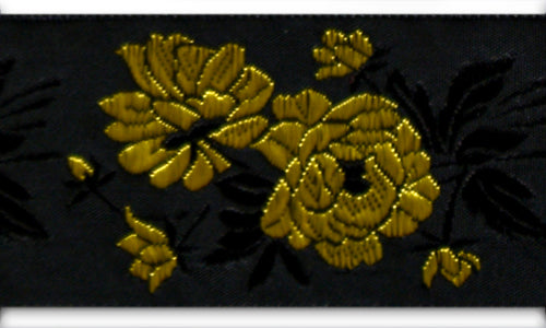 1 1/4" woven ribbon in a striking design of embroidered golden and black blossoms on a black background. 100% rayon viscose. LIMITED STOCK.