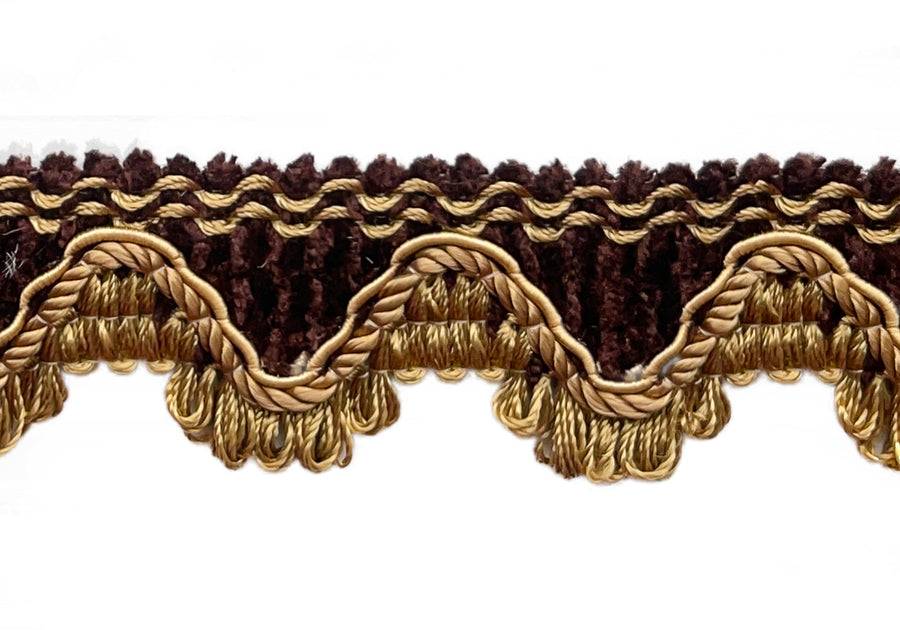 1 1/4" wide edging trim in chocolate colored bouclé, adorned with ornate gold accents and fabulous deep scallops along one edge. This trim is perfect for sewing haute couture garments such as French designer-inspired jackets - layer your trims for a unique and special look! Made in USA.