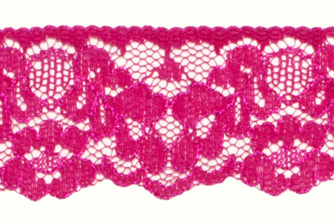 Raschel lace is similar to Chantilly lace - delicate and sweet! This is a 1 /14" wide Raschel edging lace in hot pink, a simple floral pattern and with a single scalloped edge.