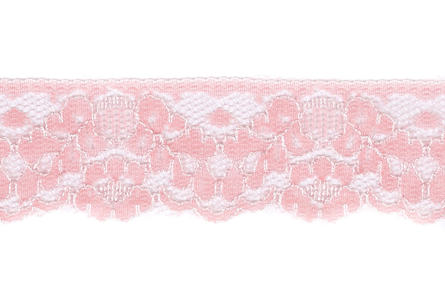 Raschel lace is similar to Chantilly lace - delicate and sweet! This is a 1 /14" wide Raschel edging lace in light pink, a simple floral pattern and with a single scalloped edge.