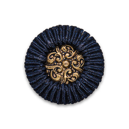 1 1/4" passamenterie button with a navy blue raised rim and an ornate antique gold center. Shank backing. Made in USA.