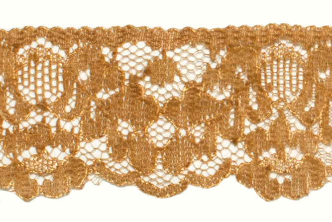Raschel lace is similar to Chantilly lace - delicate and sweet! This is a 1 /14" wide Raschel edging lace in old gold, a simple floral pattern, and with a single scalloped edge.