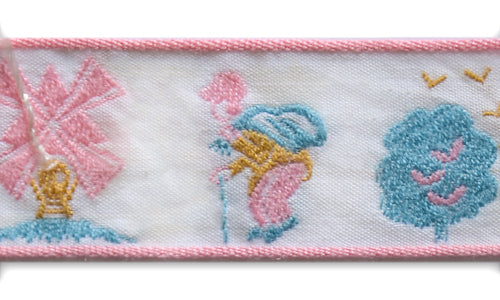 1 1/4" woven cotton ribbon, with a design of pastoral Dutch wanderers, trees, birds, and pink windmills on a white background, and with thin pink borders. 100% cotton. LIMITED STOCK.