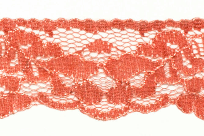 Raschel lace is similar to Chantilly lace - delicate and sweet! This is a 1 /14" wide Raschel edging lace in peachy salmon, a simple floral pattern and with a single scalloped edge.
