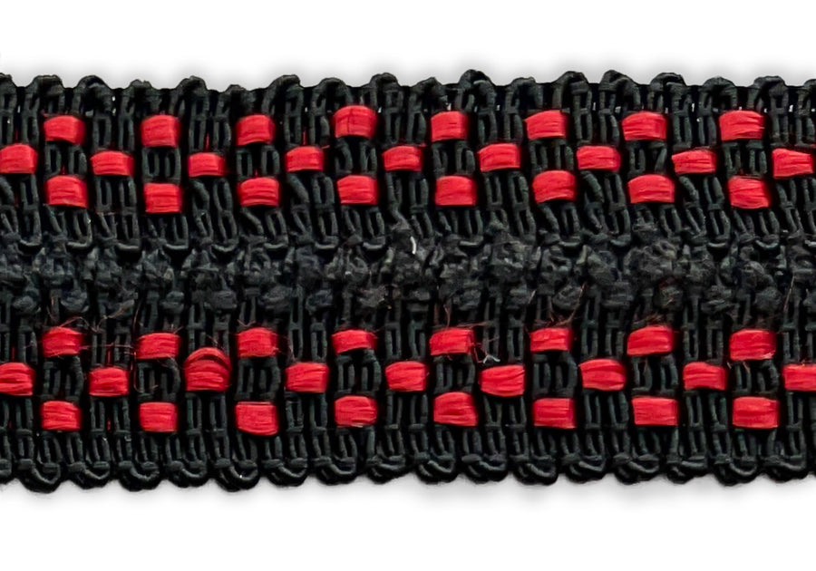 1 1/4" wide braided fold-over trim in a scarlet and black checkerboard, with shallow scallops along both edges. This trim is perfect for sewing haute couture garments such as French designer-inspired jackets - layer your trims for a unique and special look! Made in France.
