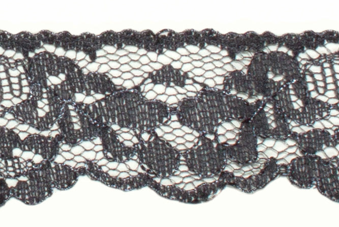 Raschel lace is similar to Chantilly lace - delicate and sweet! This is a 1 /14" wide Raschel edging lace in slate grey, a simple floral pattern and with a single scalloped edge.