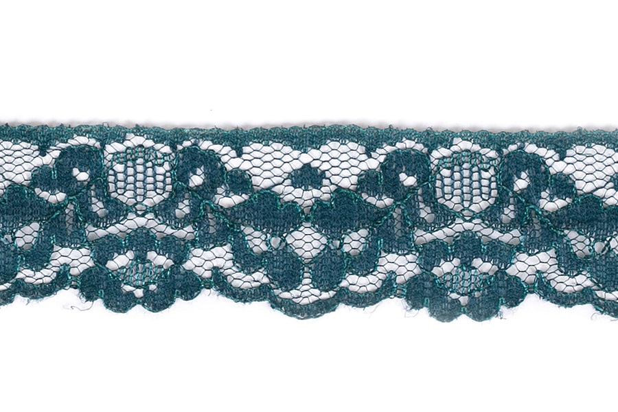 Raschel lace is similar to Chantilly lace - delicate and sweet! This is a 1 /14" wide Raschel edging lace in teal, a simple floral pattern and with a single scalloped edge.