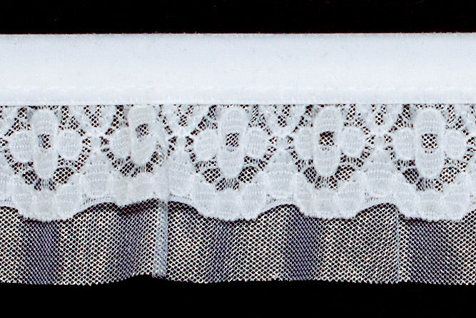 1 1/4" wide white lace and tricot, gathered onto an elasticized velvet ribbon. Made in England.