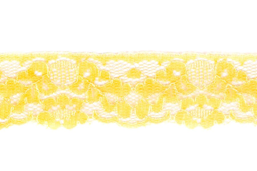 Raschel lace is similar to Chantilly lace - delicate and sweet! This is a 1 /14" wide Raschel edging lace in yellow, a simple floral pattern and with a single scalloped edge.
