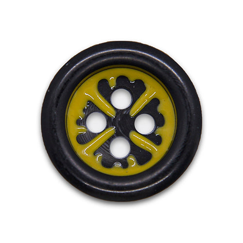 1 1/8" 4-hole plastic button in black with glossy spiced turmeric accents and a raised rim.
