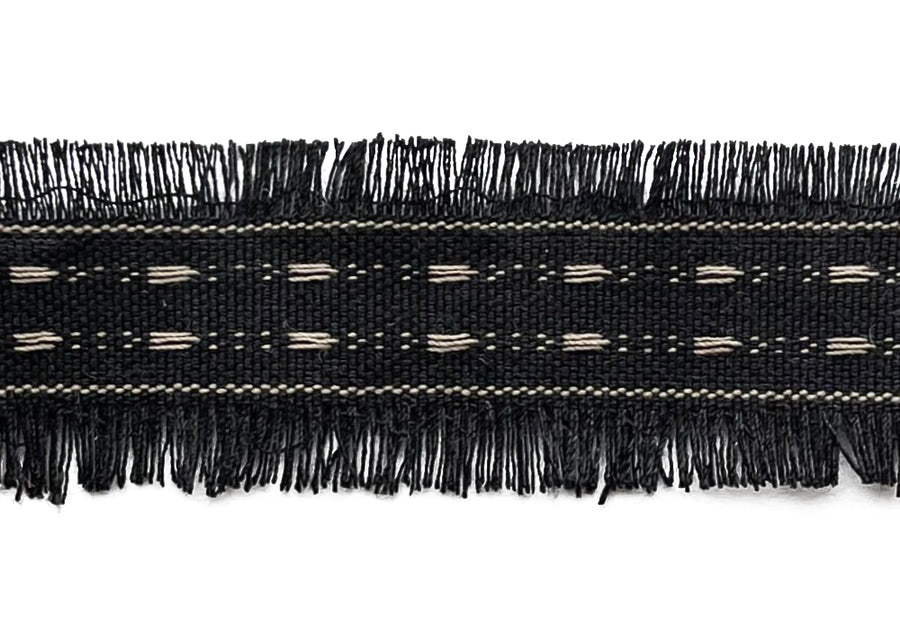 1 1/8" wide black woven trim embroidered with sand-colored running stitches and fringed on both sides. This trim is perfect for sewing haute couture garments such as French designer-inspired jackets - layer your trims for a unique and special look! Made in France.