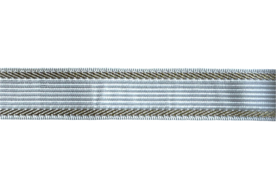 1 1/8" white brocade ribbon with narrow raised ridges down the center, flanked by metallic gold braided edges. Made in France.