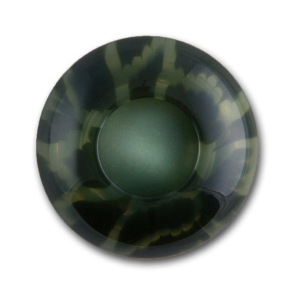 1 1/8" domed, olive green plastic button, with translucent, broad animal print rim. Plastic tunnel shank backing.