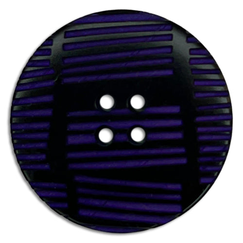 A 1 1/8" 4-hole plastic button in black with rows of decorative royal blue lines. Made in Spain.