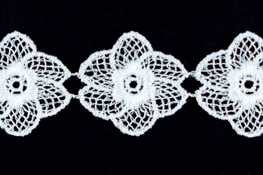 1 1/8" wide white Venise lace of flower blossoms. 100% cotton.