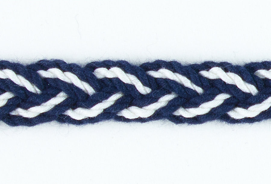 1/2" wide braided trim in blue and white. This trim is perfect for sewing haute couture garments such as French designer-inspired jackets - layer your trims for a unique and special look! 100% cotton. Made in France.