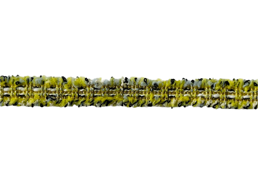 1/2" wide trim in chartreuse, black, and white, with subtle rows of metallic gold accents running through the center and short fuzzy edges.
