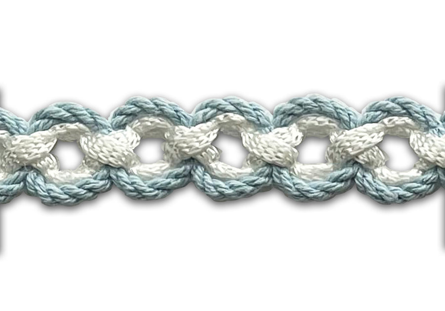 1/2" wide braided trim in an open powder blue and white circular weave. This trim is perfect for sewing haute couture garments such as French designer-inspired jackets - layer your trims for a unique and special look! Made in France.