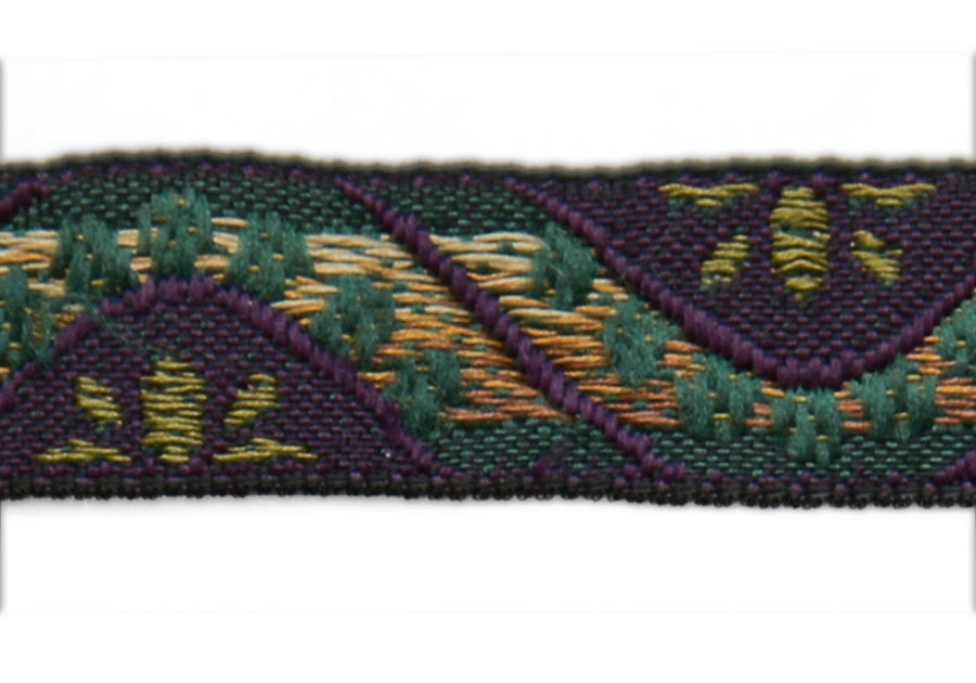 1/2" wide woven ribbon in a design of golden waves and green leaves on a rich purple background.