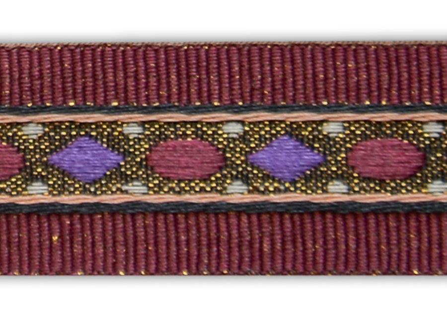 1/2" wide woven ribbon with a strip of violet and raspberry ovals and diamond shapes, along with ribbed burgundy borders.