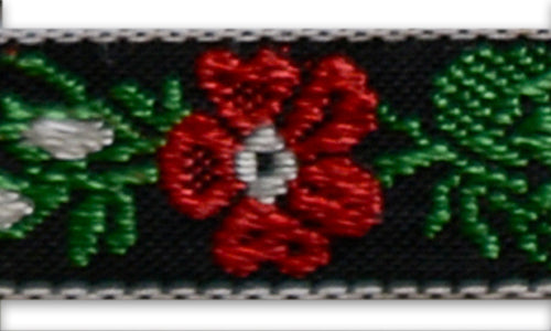 1/2" wide woven ribbon in a floral design of red and white tussie-mussies on a black background, and with very thin white borders.