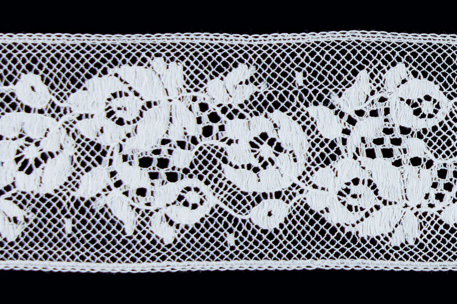 1 3/4" wide white insertion heirloom lace in a floral motif. 90% Cotton, 10% Nylon. Please use a pressing cloth and a cool iron, if you want to starch and press this lace. Made in France.