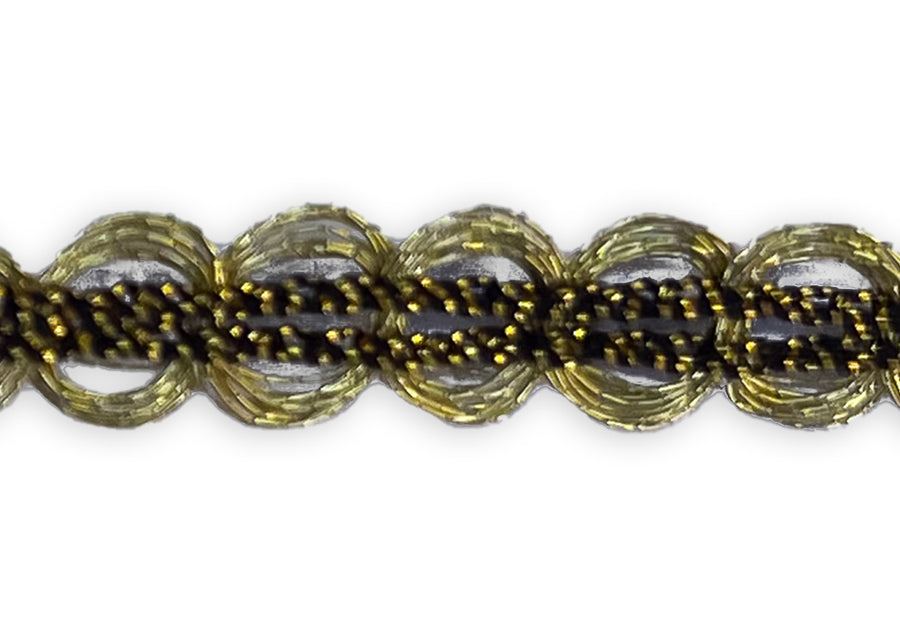 1/4" wide trim of a black and gold ribbon flanked by gold metallic scallops. This trim is perfect for sewing haute couture garments such as French designer-inspired jackets - layer your trims for a unique and special look! Made in France.