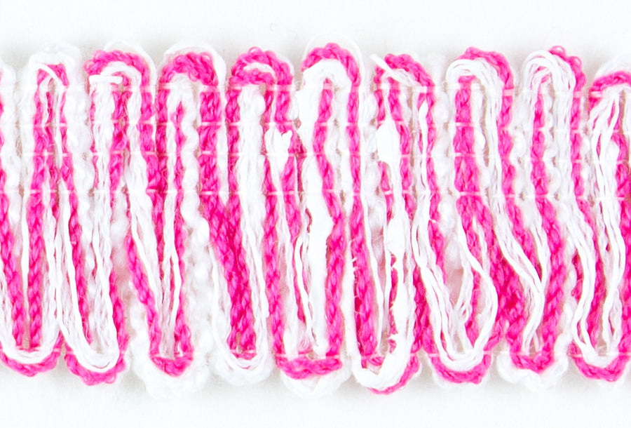 1" wide fringed trim in candy pink and white. This trim is perfect for sewing haute couture garments such as French designer-inspired jackets - layer your trims for a unique and special look!