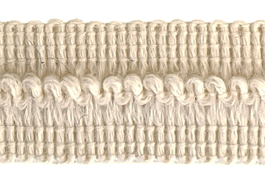 1" wide wool gimp trim in cream, with slightly raised center loops flanked by flatter edges. This trim is perfect for sewing haute couture garments such as French designer-inspired jackets - layer your trims for a unique and special look! 100% polyester. Made in Germany.