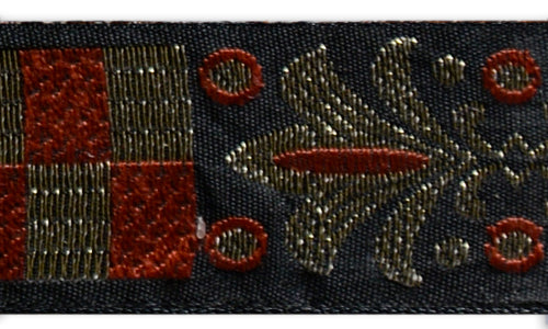 1" wide woven ribbon in a burnt orange and antique gold mirrored heraldic shield and fleur-de-lis design on a black background. LIMITED STOCK.